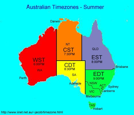 CST loopt een half uur achter op EST en WST loopt twee uur achter op EST. Om het allemaal nog even wat simpeler te maken kent Australie, behalve de staten Northern Territory, Western Australia and Queensland, zomertijd (daylight saving) in de zomermaanden. Als gevolg hiervan bestaan er dan 5 tijdszones in Australie. In 2001 eindigt de zomertijd op 25 maart 2001 en begint weer op 28 november 2001. Tasmania begint echter al op 7 november 2001 (3 weken eerder!) met zijn zomertijd. Alle grote plaatsen die wij bezoeken, hebben we hier op een rijtje gezet, zodat je kunt zien in welke tijd we op dit moment leven (dan weet je tenminste wanneer je NIET moet bellen!